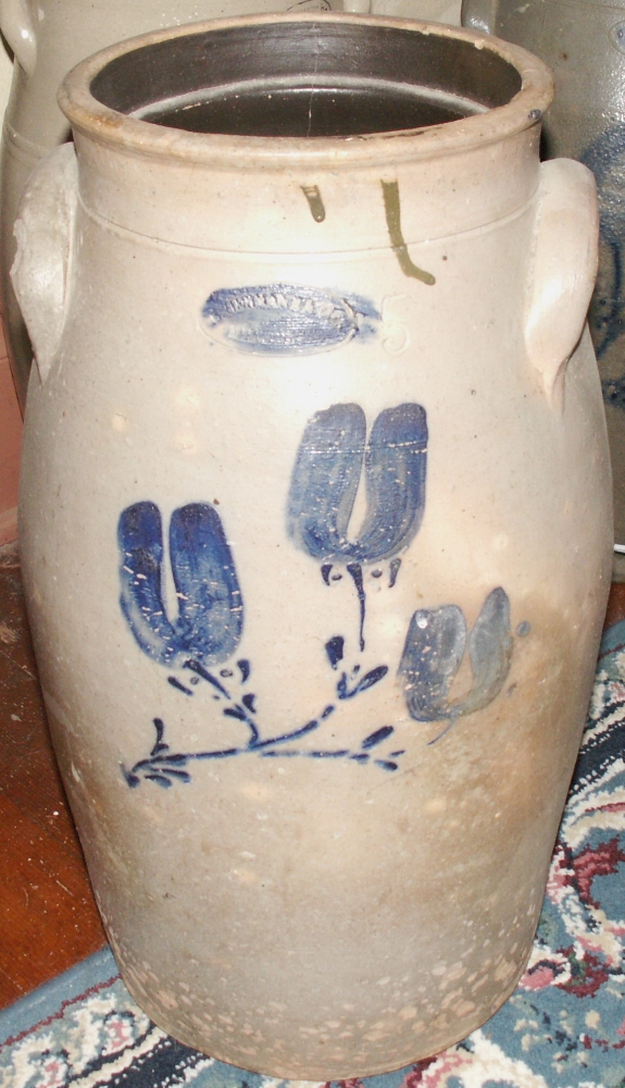 This is a 6 gallon decorated marked butter churn is from the Charles Hermann, Stoneware Factory, Milwaukee, WI 1870's era. WHat makes this one unusual is the fact that the decoration is both stencil and hand brushed. (JFS collection)